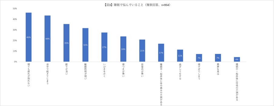 また、睡眠の悩みを具体的に聞くと、「寝ても疲れが取れない」(46.1%)、「途中で起きて