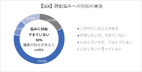 図3で具体的な睡眠悩みを挙げた人に睡眠の悩みに対する対処法について聞きました。18%は睡眠の悩みに対処しようと心がけているのに対し、59.6%の人は「対処したいができていない」、10%は「対処していたが、今はしていない」、12.2%は「対処したいと思っていない」と答え、78%の人は睡眠の悩みがあっても何もせず放置しているようです[図4]