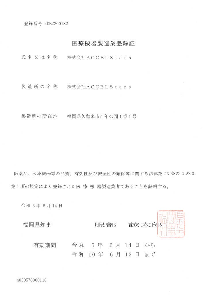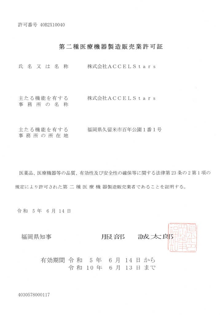 株式会社ACCELStars(読み方:アクセルスターズ、本社:福岡県久留米市、代表取締役:宮原禎、以下ACCELStars)は、2023年6月14日付で第二種医療機器製造販売業許可(*1)を取得いたしました。