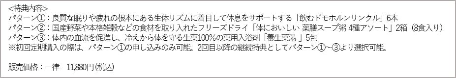 再春館製薬所が運営する外部ECサイト「Lashiku」特設オンラインショップの定期購入の第一弾の商品は、睡眠の質向上と肌保湿の機能を併せ持つ、夜の和漢ドリンク「飲むドモホルンリンクル」。初回定期購入時には「飲むドモホルンリンクル」30本に、同商品が6本付いてくる定期限定の「お得」な特典付き。さらに2回目以降の定期購入の継続特典として、3パターンから好きな特典を毎回選択することが可能となります。
