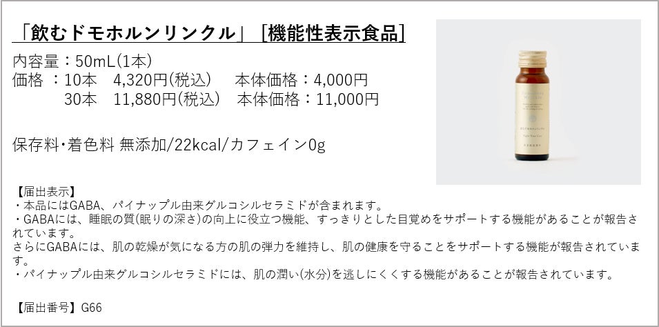 飲むドモホルンリンクルは、 睡眠の質を向上し、翌朝のすっきりとした目覚めまでをサポートします。また、夜は体内のバリア機能が低下し、眠っている間のうるおいは失われがちという現象を踏まえ、「水分蒸散量の抑制」にも着目。さらに「肌弾力の維持」へのアプローチで、内側からの健やかさをサポートする“夜”のためのインナーケアを追求しました。