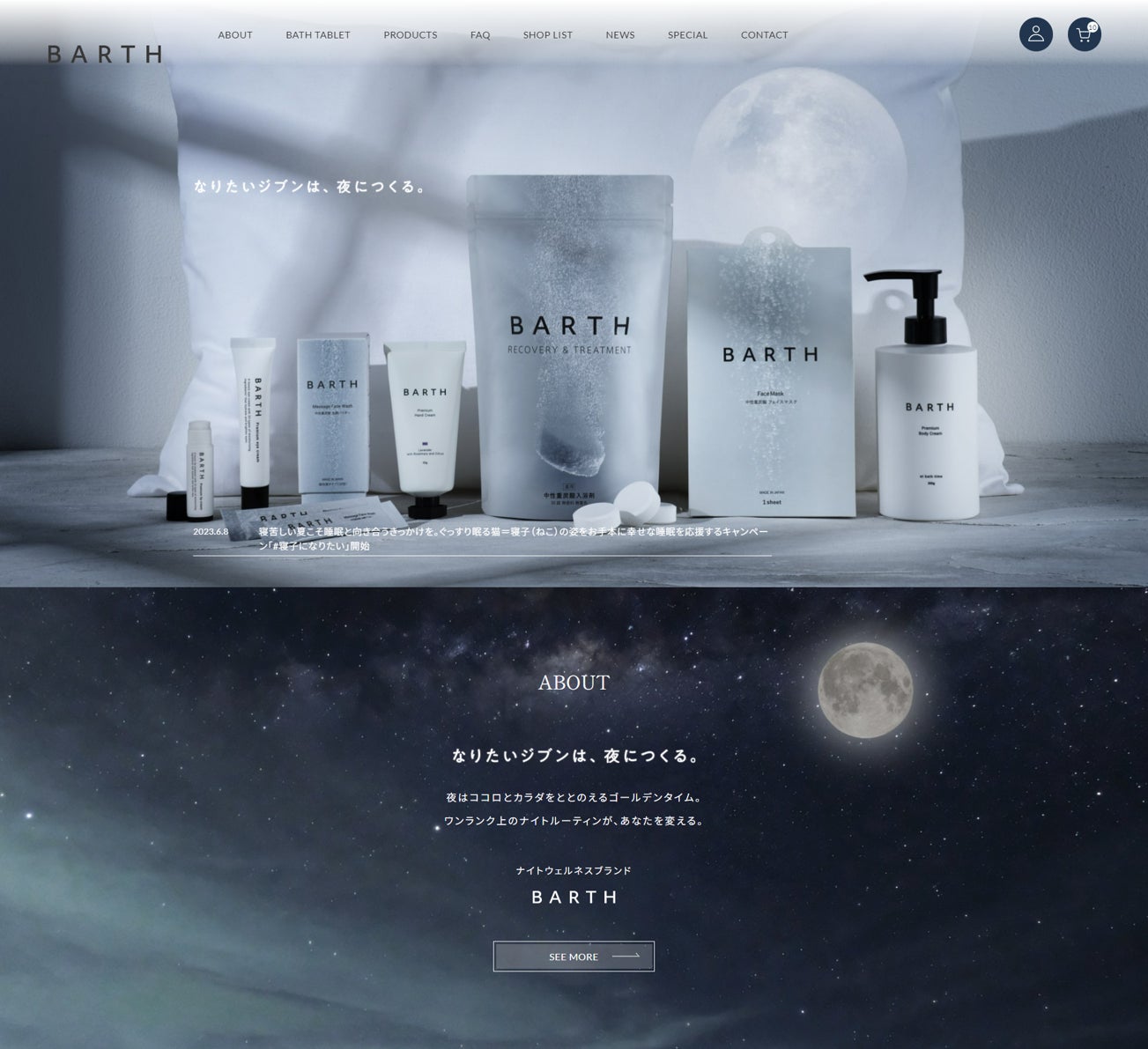 ブランドサイトは、ナイトウェルネスブランドへと生まれ変わったBARTHの新しい世界観を表現するデザインへとリニューアルしました。商品を認知・理解いただくだけでなく、中性重炭酸入浴剤ブランドから“ワンランク上のナイトルーティン”を叶えるブランドへとパワーアップした私たちの想いを届ける場となります。
