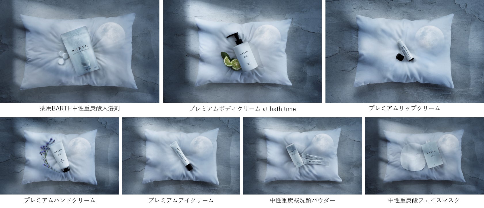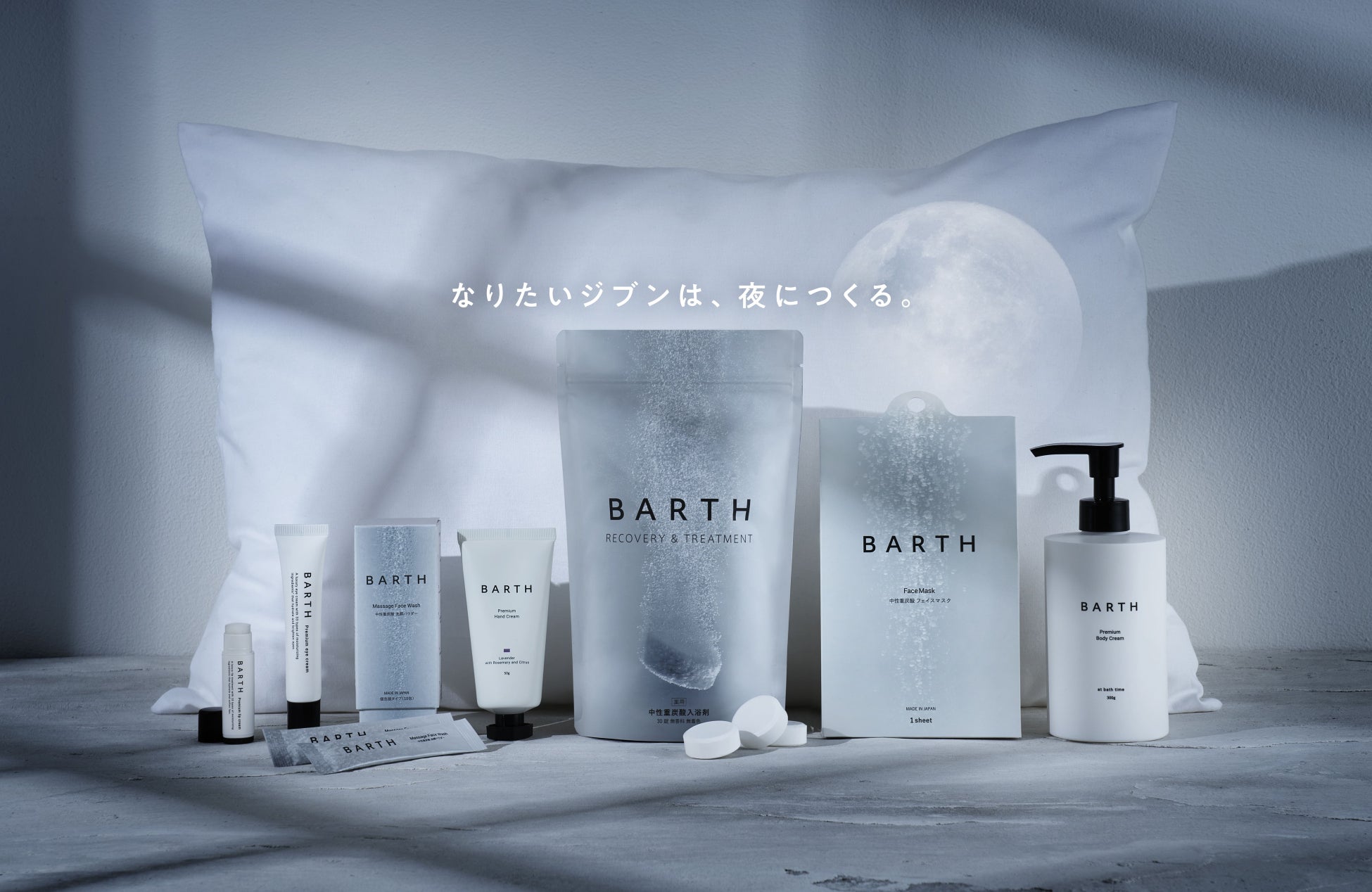 世界でも希少な中性重炭酸泉から着想を得た「薬用BARTH中性重炭酸入浴剤」をはじめとして、ナイトタイムを充実させるプロダクトを展開。“入浴”や“睡眠”といった何気ない日々の暮らしにワンエッセンス加えるだけで満たされる、プレミアムなナイトケア体験を提供します。