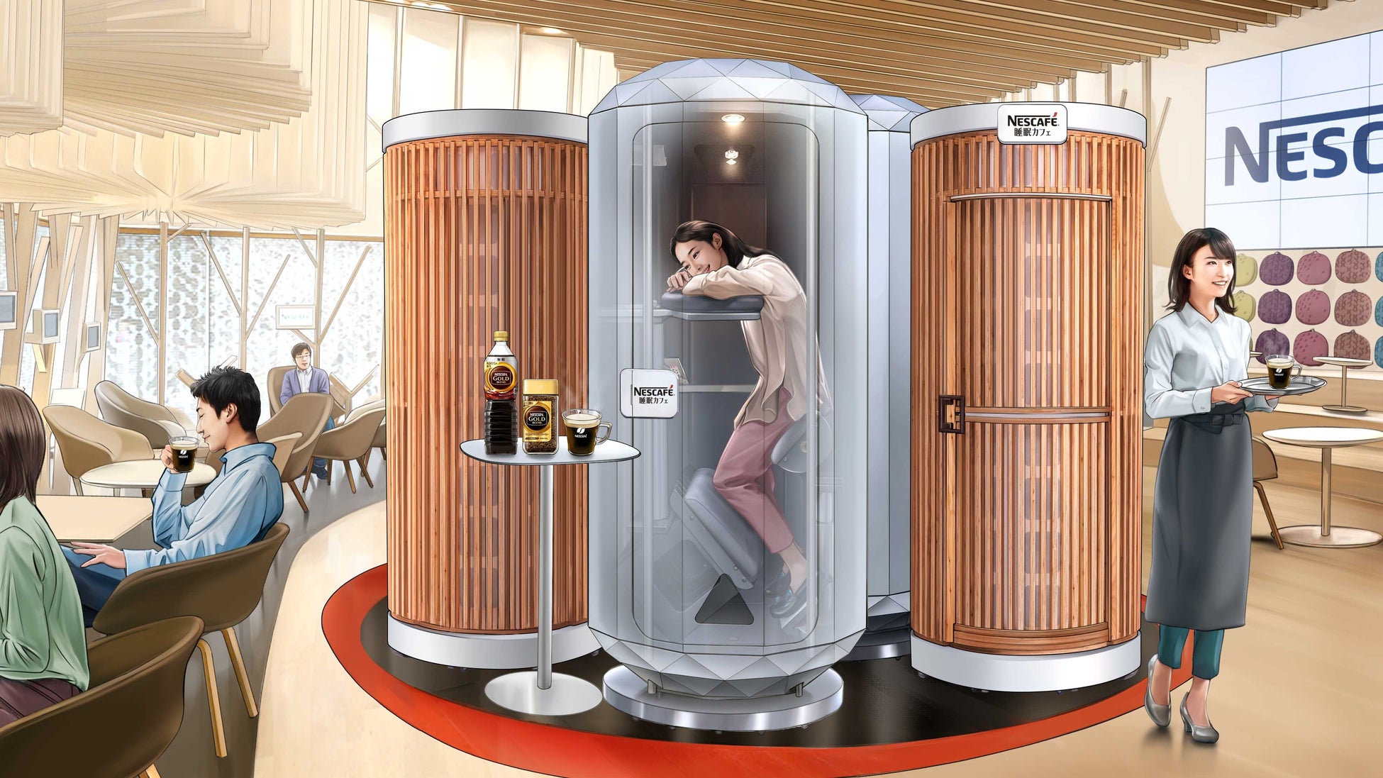 そこでこの度、コーヒーを通じた睡眠スタイルを学び・体験できる「ネスカフェ 睡眠カフェ」と、立ったままくつろげる縦型仮眠用ボックス「giraffenap(ジラフナップ)」を組み合わせ、“立ってお昼寝”スタイルでコーヒーナップを学び・体験できる日本初(※)のサービス「ネスカフェ 睡眠カフェ × ジラフナップ “立ち寝コーヒーナップ”体験席」を期間限定で設置します。(※自社調べ、2023年7月、【公開番号】P2020-99444A 人体収納用構造体及び睡眠用筐体 を使用した “立ち寝”スタイル仮眠用ボックスとコーヒーナップのセットでの体験提供において)