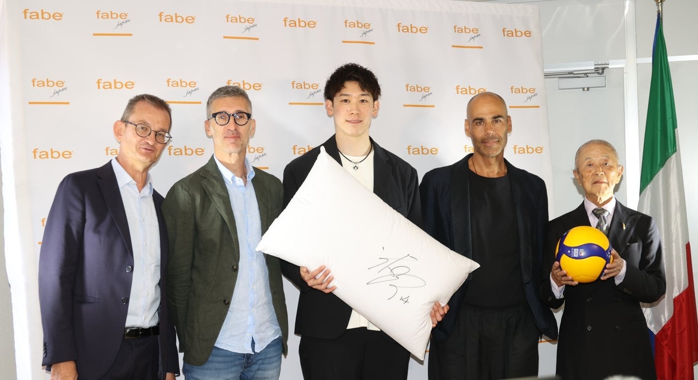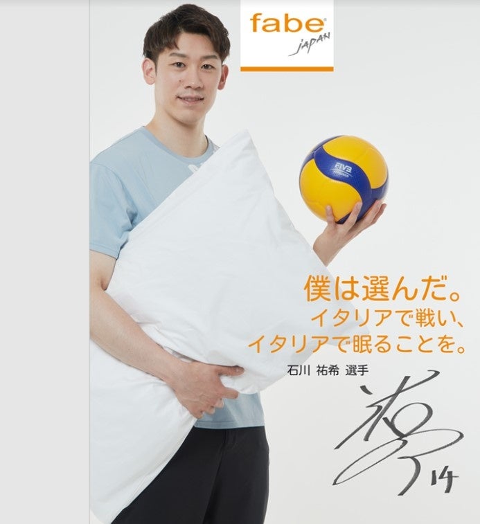 「Fabe社(ファべ)」は、日本の企業である株式会社カタログハウスの協力を得て、1990年から日本市場に参入しています。それ以来、常にトップセラーの「メディカル枕」を含む同社製品の流通に貢献していただいています。長年にわたり、日出ずる国における「Fabe社(ファべ)」ブランドへの評価は、カタログハウスの創設者である斎藤駿氏と当社社長のPIETRO FABEMOLI(ファベモリ・ピエトロ氏)との間に培われた友情と尊敬に密接に結びついてきました。 枕は休息のための大事な基本要素です。 このため、「Fabe社(ファべ)」の枕製造においては、継続的な研究、緻密な設計、デザインへの細心の注意によって構成されています。 60年間にわたり、当社は最高の技術と高性能素材を用いた「Made in Italy 枕」の製造だけに注力してきました。「Fabe社(ファべ)」と石川祐希選手とのアンバサダー契約を思案したのは、彼が日本とイタリアの両国でのトップアスリートであるからです。彼は非常に意思の強い青年であり、「Fabe社(ファべ)」が1980 年以来追求してきた情熱、不変性、卓越性、完璧性への継続的な探求といった価値観を体現できる数少ないアスリートの一人です。メディカル枕は、首やスポーツ後の筋肉痛の緩和だけでなく、その予防にも最適です。だからこそ、石川祐希選手は常にトッププレイヤーであり続け、スポーツにおけるあらゆる問題を克服できるよう、当社の枕を使用してくれています。 この数年間、「Fabe社(ファべ)」は石川祐希選手と同じく、多くの課題に直面し、克服しなければなりませんでした。大切なのは自分と自分の能力に自信を持つことです。それが石川祐希というアスリートの長所でもあると知っています「Fabe社(ファべ)」と石川祐希選手のコラボレーションを通じ、若者だけでなく、あらゆる年齢のスポーツ選手やスポーツ愛好家たちにも幅広くアプローチしたいと考えています。スポーツは健康にも良く、「Fabe社(ファべ)」の枕と同様に快適な睡眠を与えてくれます。イタリアと日本、手を取り合って行きましょう!