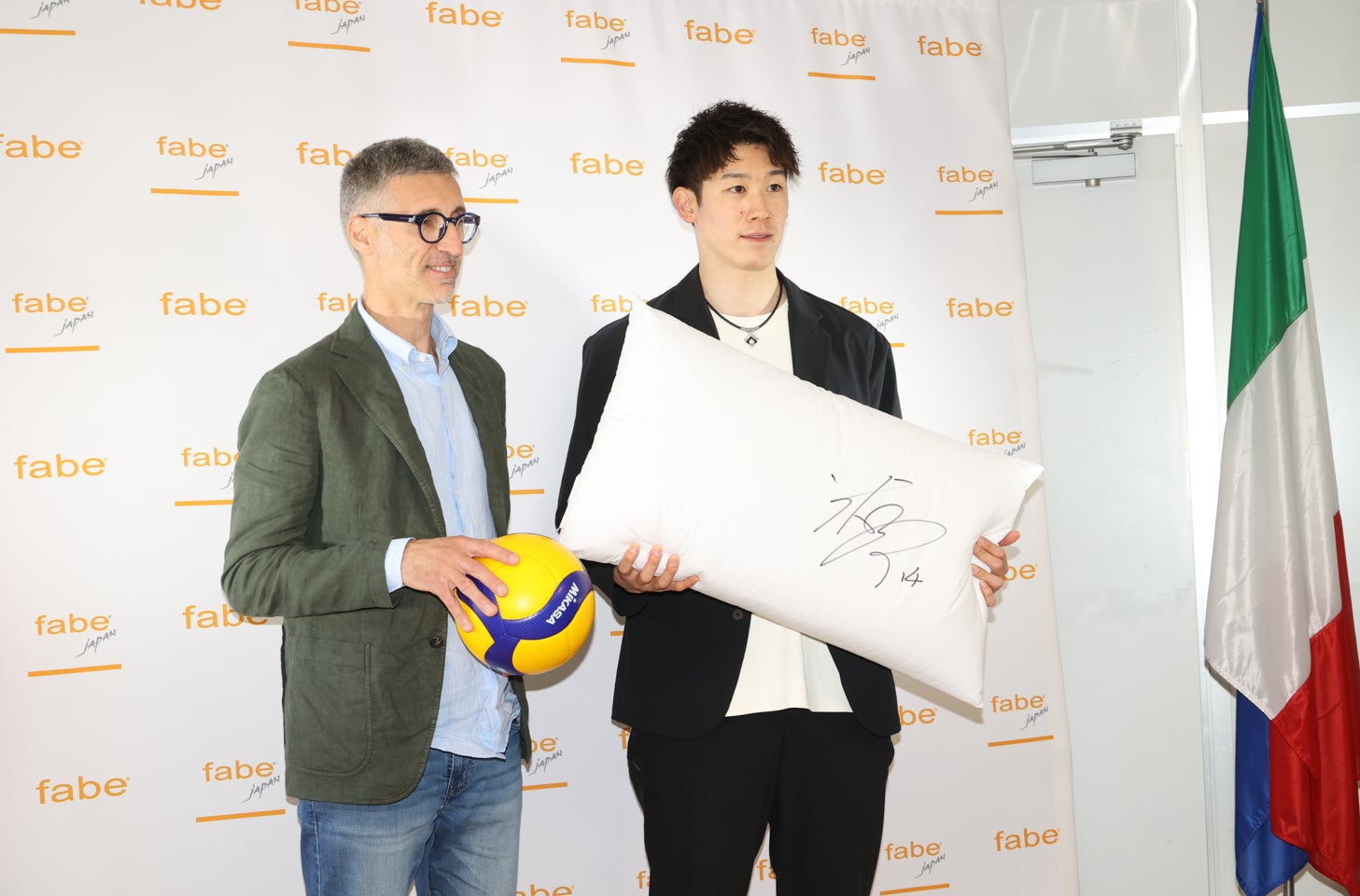 7月28日(金)在日イタリア商工会議所にて、「Fabe社(ファべ)」初代ブランドアンバサダー「石川祐希選手」就任記者会見を開催しました。石川選手は、流暢なイタリア語で、「FABEブランドアンバサダーに選ばれたことに誇りに思い、「Fabe社(ファべ)」のみなさんに感謝の意伝えたい。「Fabe社(ファべ)」の商品は、とても快適であること、睡眠の質を上げて眠ることは大切。日本のみなさんにもその良さを伝えていきたい。」とブランドアンバサダーとしての想いを語った。「Fabe社(ファべ)」のメディカル枕を愛用していて、睡眠の質も向上しています。試合でのパフォーマンスを発揮できるようになりました。自宅では大きなサイズのメディア枕を愛用していています。そして、イタリアでの試合遠征の時は、持ち運びに便利なポータブルサイズの自分のサイン入りのものを愛用している。これまでの枕とは全く違うその高品質な機能性で良質な睡眠をもたらしてくれる。46年ぶりの銅メダルを獲得したネーションズリーグでも、「Fabe社(ファべ)」社の持ち運び用の枕を持参しました。幸いにケガもなく、メダルを獲ることができました。本当に良い睡眠と僕のバレーボールのパフォーマンスは深く関係していると実感しています。9月30日から東京で開催されるパリ五輪予選を兼ねたワールドカップの時ももちろん持参します。2024年パリオリンピックへの切符を勝ち取るという目標を実現したい」と話した。さらには、「18歳からイタリアでバレーをプレーしているからこそ「Fabe社(ファべ)」初代ブランドアンバサダーとしてのビジネスチャンスを得ることができました。「Fabe社(ファべ)」の商品の良さを日本のみなさんにお伝えできることは大きな喜びです。メディカル枕で睡眠の質をさらに高め、イタリアでのパワープレーにもっともっと磨きをかけて、イタリアでのバレーボール選手としての知名度をもっと高めていきたいです。」と将来の展望を語った。