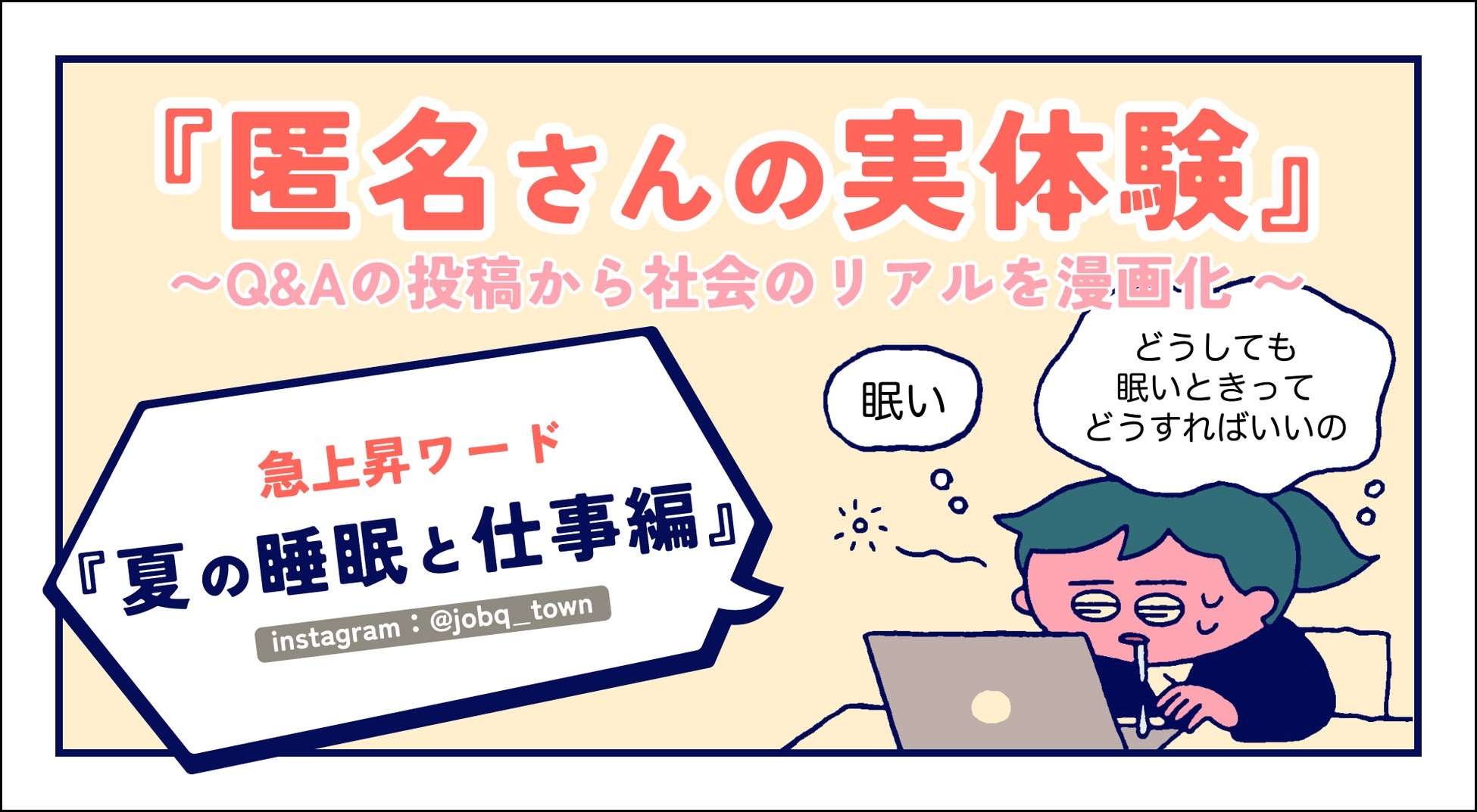 株式会社ライボ(本社:東京都渋谷区 代表取締役:森 宏記 以下「ライボ」)が運営するキャリアや就転職に特化した匿名相談サービス『JobQ Town(ジョブキュータウン)(※1)』(以下JobQ Town)にて、「夏の睡眠と仕事」に関するQ&A(※2)投稿へのアクセスが急上昇しています。これら社会人のリアルな声を漫画化したInstagramアカウント「匿名さんの実体験(※3)」にて同ワードをテーマとして漫画を公開しました。