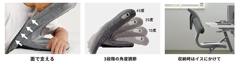 目指したのはクイックマッサージ台のあの姿勢です。本製品はオフィスの昼寝に多く見られる、机にうつ伏せ寝の困りごと(息がこもる、腕がだるい)を改善します。本製品は上半身を面で支えることで肩や背中の力を抜いて、快適な昼寝姿勢を保ちます。また3段階の角度設定で体格に合わせて調節できます。