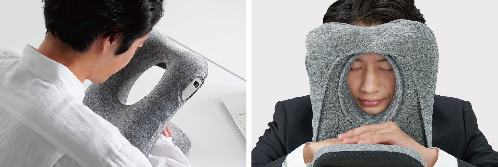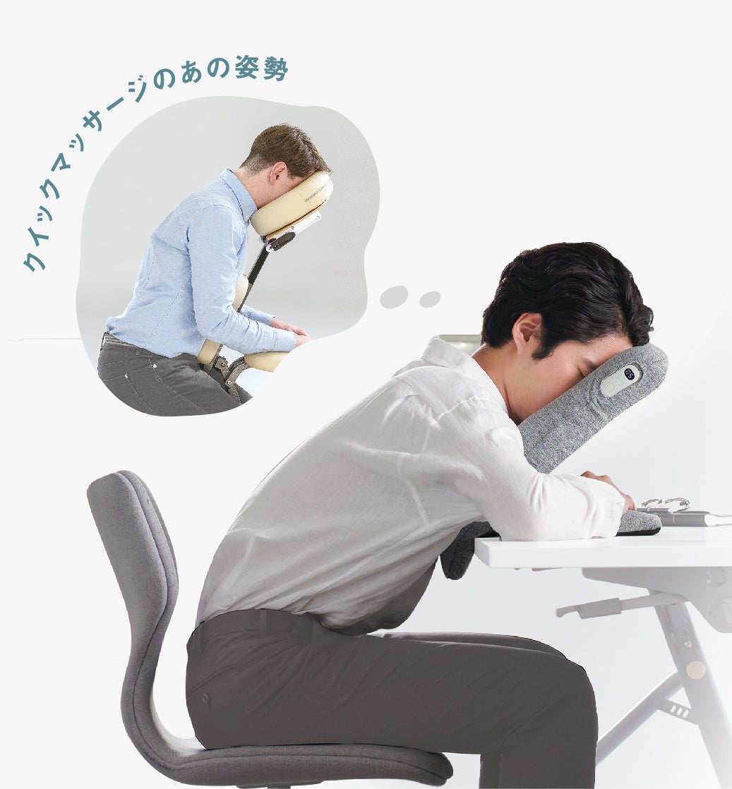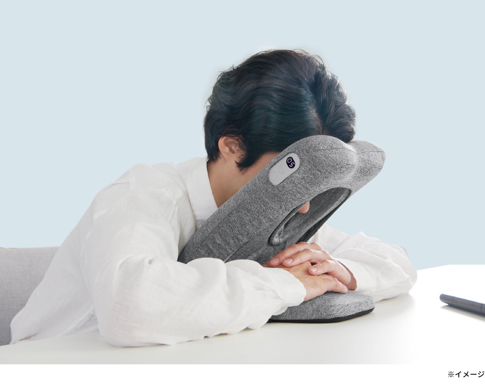 オフィスでの昼寝に特化した新しいスタイルのまくらです。デスクでの心地よい昼寝を追求し、上半身をしっかりと支えながら、安定した寝姿勢をキープします。最大60分までの振動タイマー付き(1分単位で設定)で、使わない時は折りたたんで収納できます。