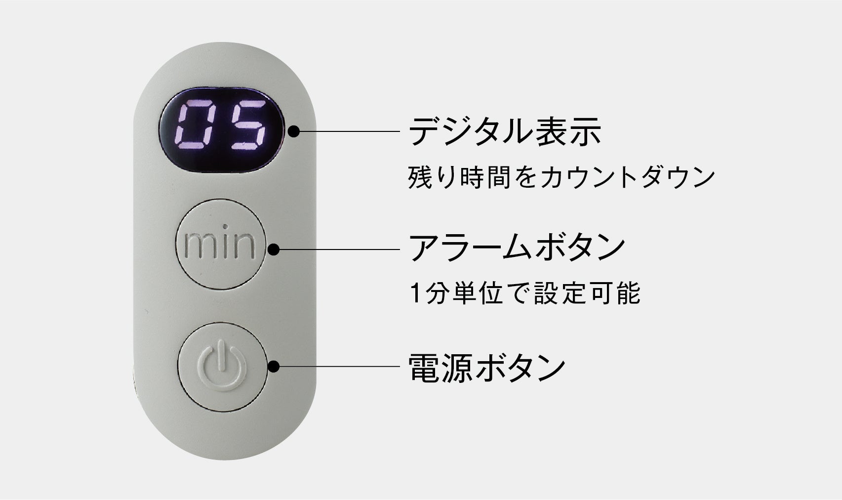 最大60分まで設定できるタイマー機能付きです。昼寝をしたい時間をセットすると、カウントダウンで表示します。振動式なので周りの人に気づかれることなくスマートに起きられます。