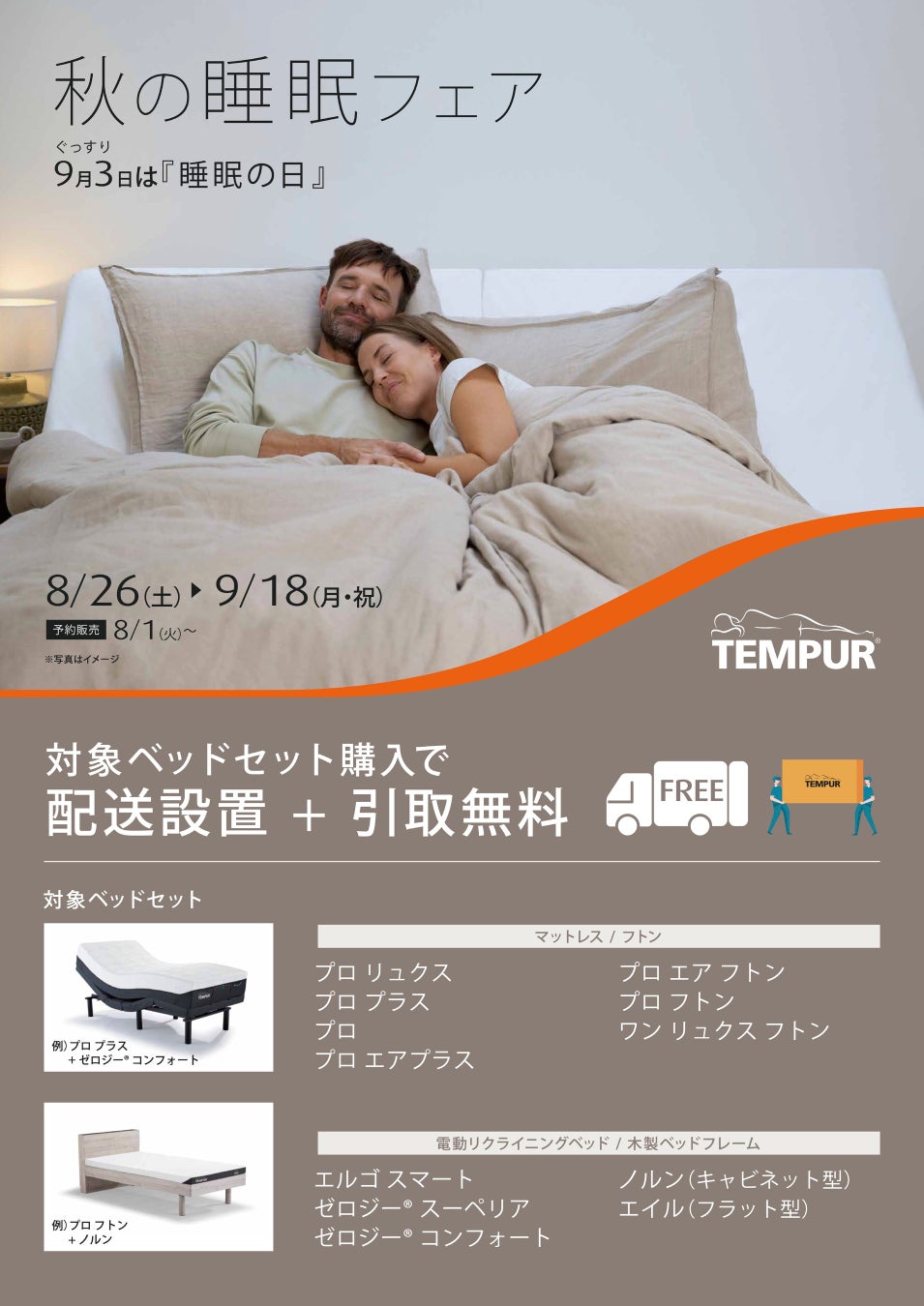 ・「秋の睡眠フェア」概要期間:8月26日(土)~9月18日(月・祝) ※予約販売は8月1日(火)より受付中URL:https://jp.tempur.com/campaign/autumn-sleep.html対象:以下のベッドセットをご購入の方 ①マットレス&電動リクライニングベット ②フトン&木製ベッドフレーム 特典:配送設置+引取無料 |