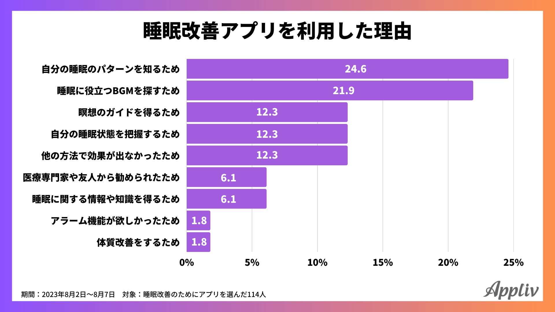 アプリで睡眠改善を試した114人にアプリを選んだ理由を聞いてみると、最多は「自分の睡眠パターンを知るため(24.6%)」、続いて「睡眠に役立つBGMを探すため(21.9%)」となりました。