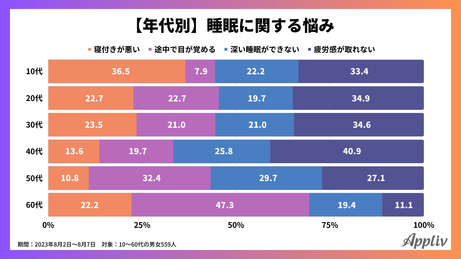 Applivでは、睡眠改善に関するアンケートを実施し、睡眠に関する世代別の悩みや改善方法、睡眠改善アプリの利用経験などを調べた結果を公開します。