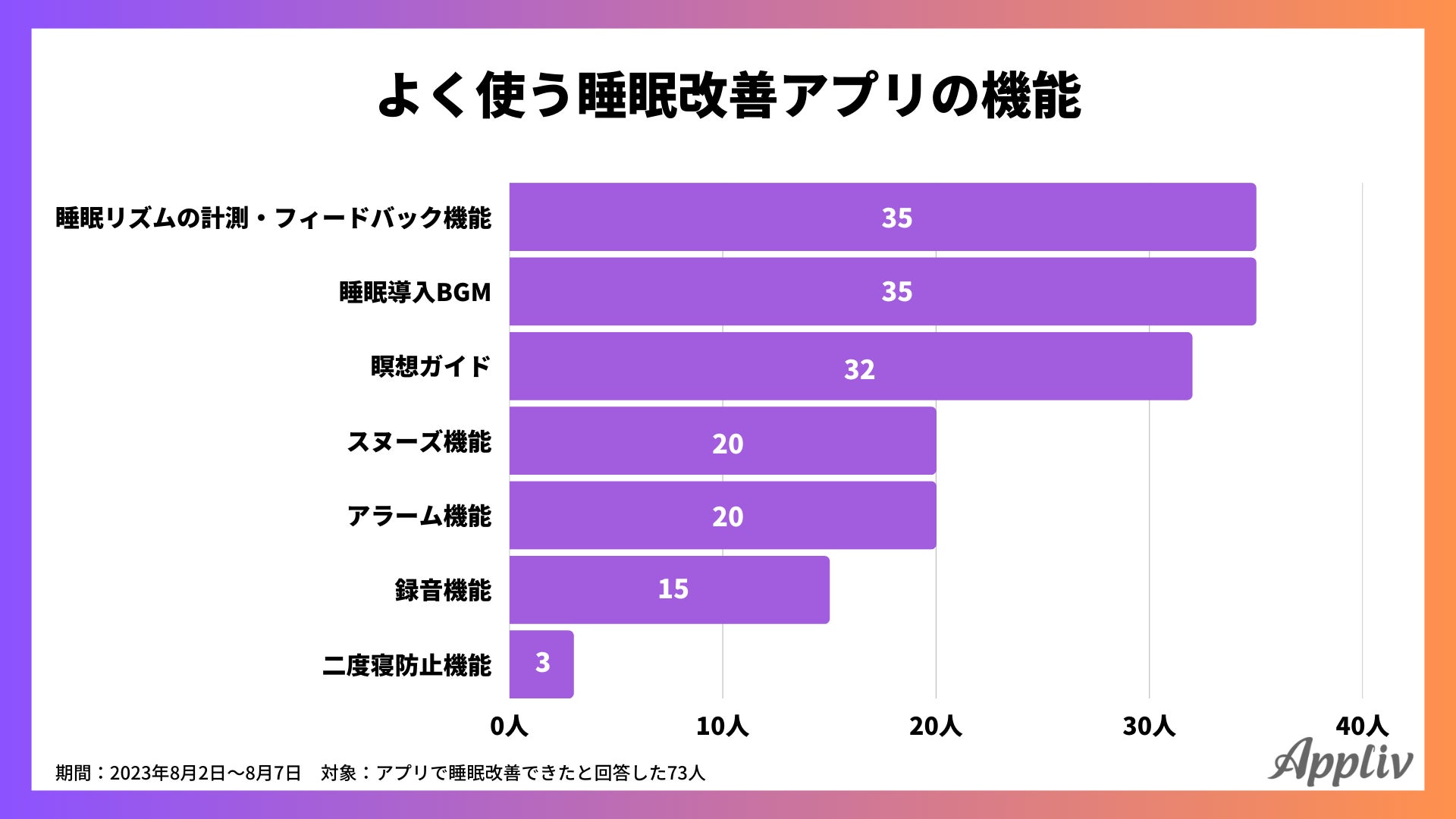 スヌーズやアラーム、二度寝防止など、目覚めをサポートする機能をメインに利用している人もいることから、自分の目的にあわせたアプリを見つけて利用していることが分かります。