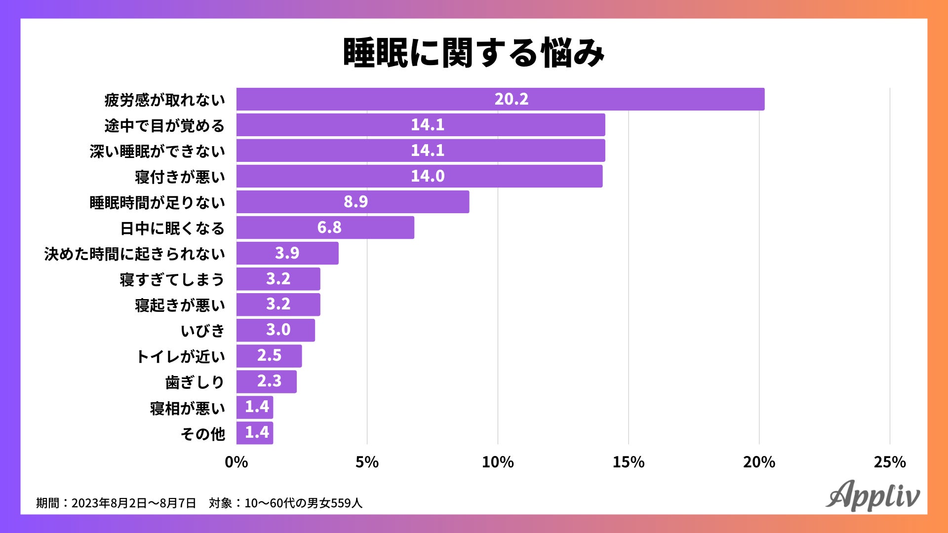 続いて「途中で目が覚める」、「深い睡眠ができない」が14.1%、「寝付きが悪い」が14.0%となっており、睡眠の質に関する悩みを抱えている人が全体の8割近くを占めていることが分かりました。