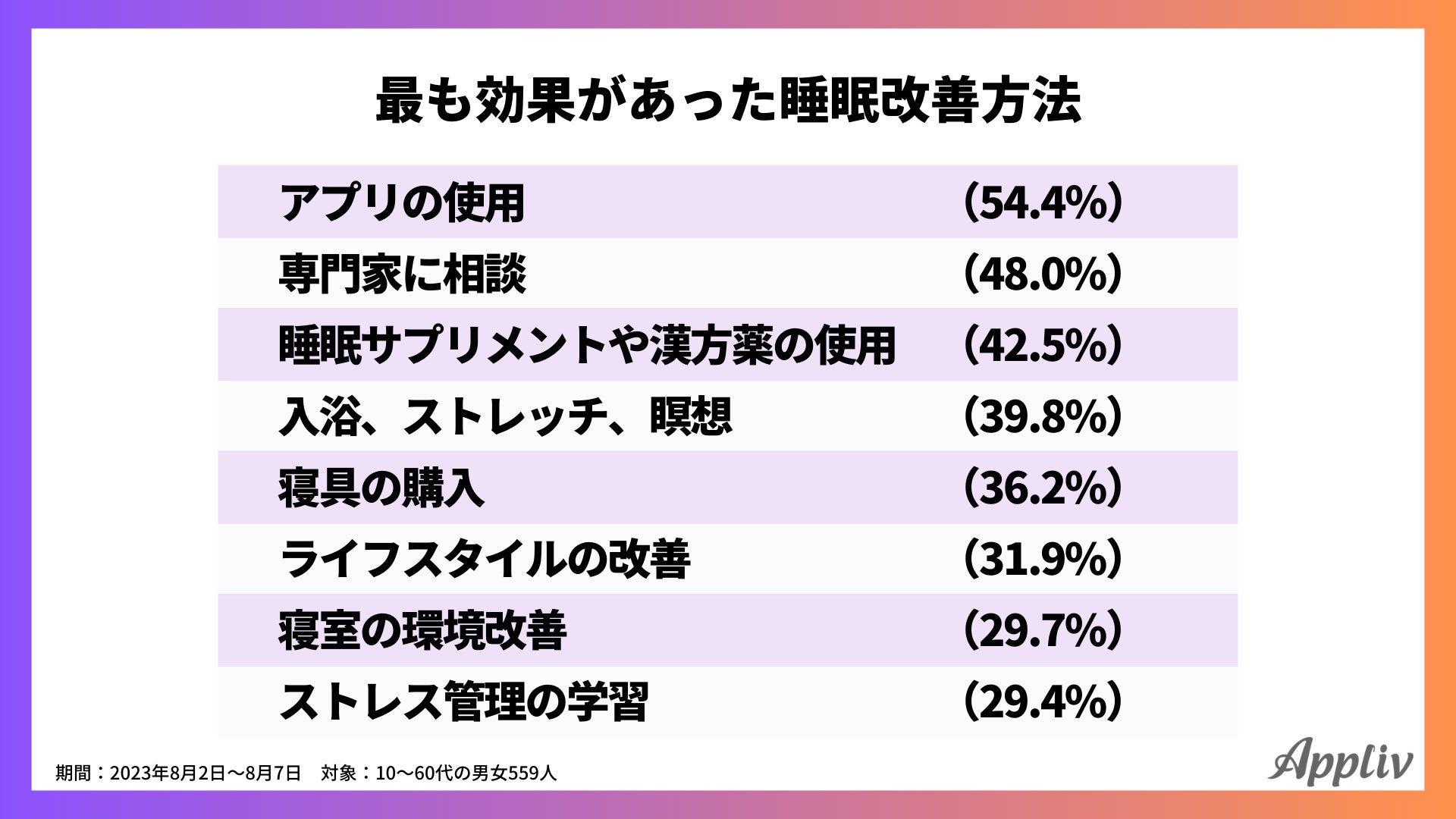睡眠を改善するために試した方法の中で最も効果を実感できた方法は、1位「アプリの使用」、2位「医療専門家への相談(48.0%)」、3位「睡眠サプリメントや漢方の使用(42.5%)」でした。