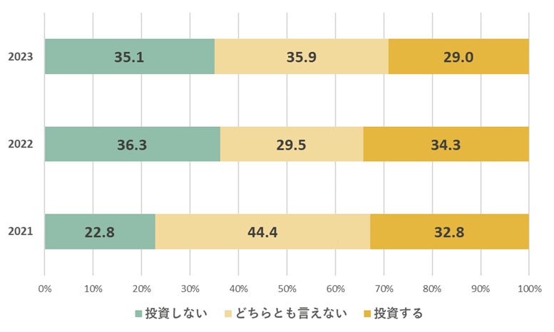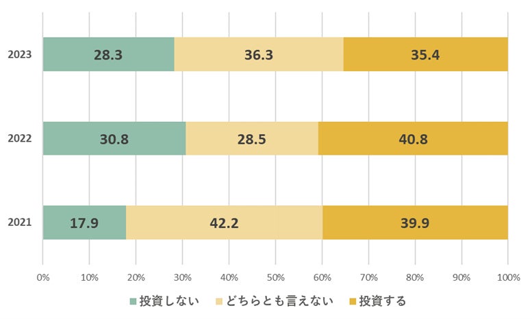健康に【お金】を投資する人は2021年32.8%、2022年34.3%、2023年29.0%と推移しており、こちらもこの2年で3.8%減少、投資しない人は2021年22.8%、2022年36.3%、2023年35.1%となり12.3%増加しています。いずれにしても健康に対する投資意識は減少、投資しない人が増加という結果となりました。