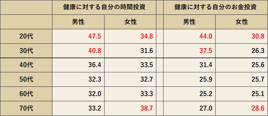 • 健康に時間投資意識のある人は、男性は20代、女性は70代が最も多く、健康にお金投資意識のある人は男女とも20代が最も多い