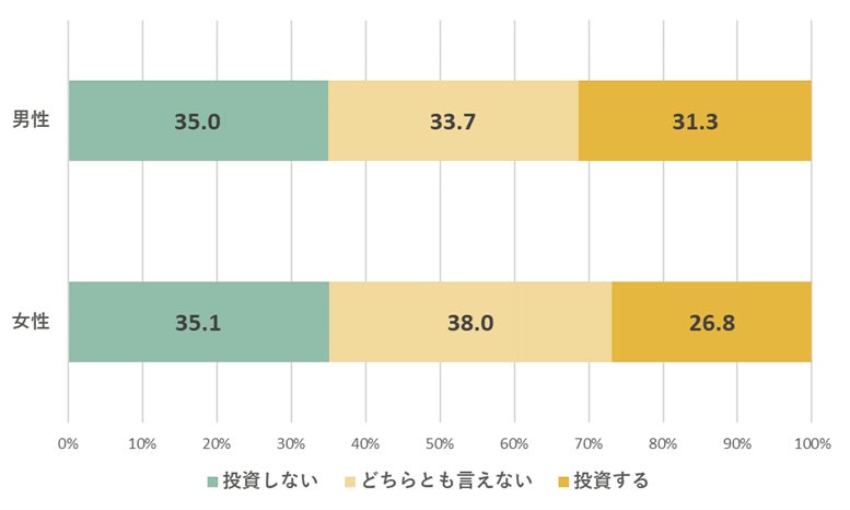 女性で投資する意識は20代34.8%、30代31.6%、40代33.5%、50代32.7%、60代33.3%、70代38.7%となっており、70代が最も高く、次いで20代、40代と続く結果となっています。