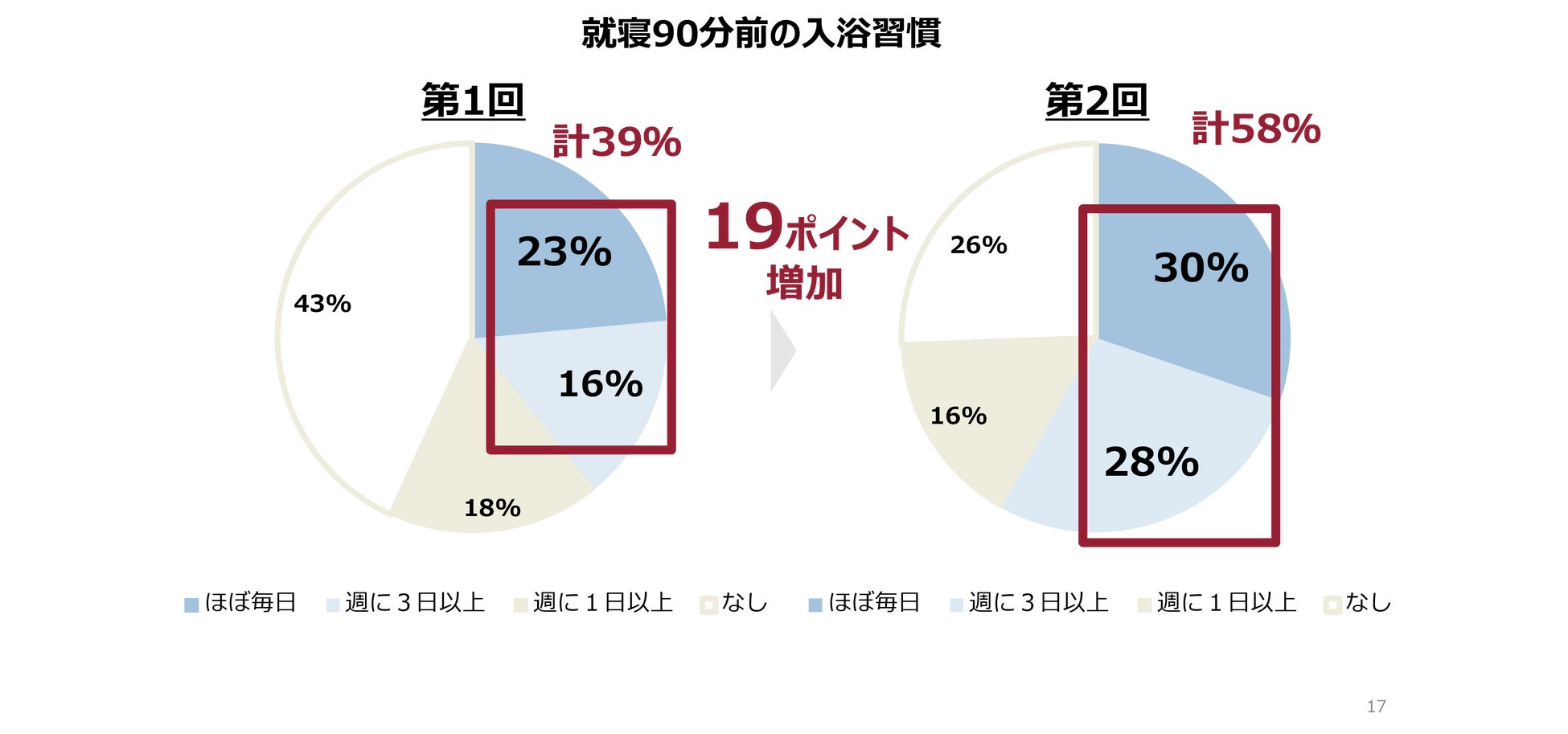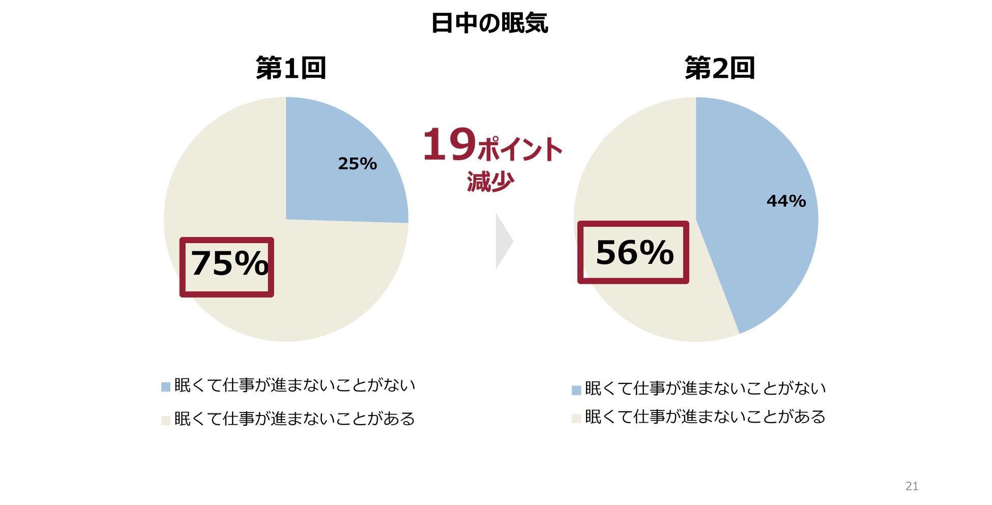 また日中の眠気に関しては、開始前75%の人が「眠くて仕事が進まないことがある」と回答していた方が、実施後は75%から56%になり、19ポイント改善しました。