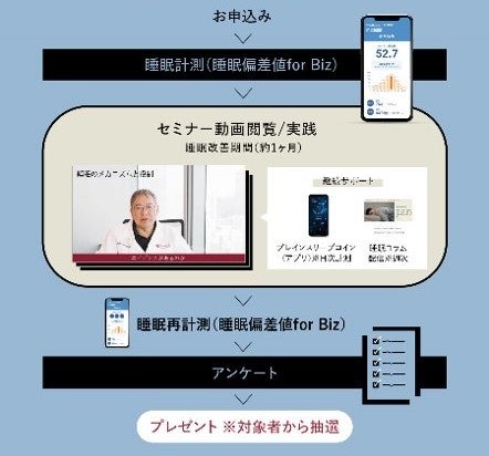 また、ブレインスリープが提供するスマートフォンのアプリケーション「ブレインスリープ コイン※3」を用いて、1か月間の自身の睡眠状態の可視化に加え、睡眠改善コンテンツ(E-learning形式のセミナー動画)や睡眠意識向上のための定期的な睡眠コラム発信等、睡眠改善の効果が実証された特別コンテンツを提供しました。