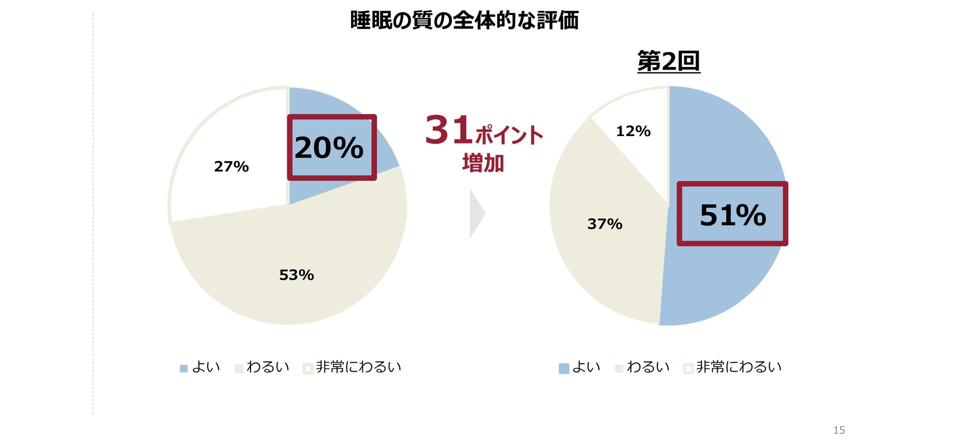 睡眠偏差値改善に大きな影響を与えた睡眠の質ですが、具体的には睡眠改善プログラムの実施前後では「睡眠の質がよい」と回答した人が31ポイントアップしたことがわかりました。