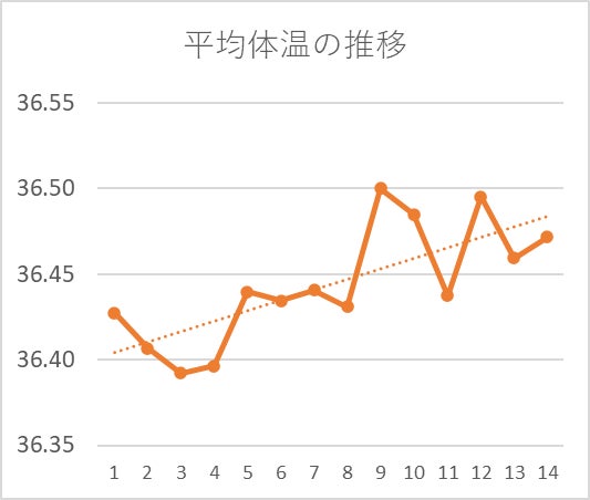 また、日々の平均体温を折れ線グラフで見ると、右肩上がりに上昇していることがわかります。