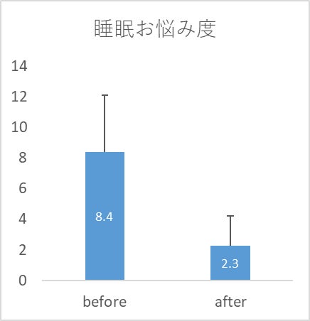 睡眠のお悩み評価に使ったアテネ不眠尺度は8項目の質問からなり、その点数によって『1~3点:睡眠がとれています、4~5点:不眠症の疑いが少しあります、6点以上:不眠症の可能性が高いです』と評価され、点数が高いほどお悩みが深いことになります。今回チャレンジ前は平均8.4点であったのが、2週間チャレンジ後では平均2.3点に下がり、改善が示されました。
