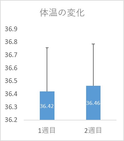 2週間のチャレンジ期間中、参加者の皆様には毎日同じ時間帯に体温測定をして頂きました。その結果、1週目の平均値と2週目の平均値を比較すると、2週目で有意に体温が上がっていました。