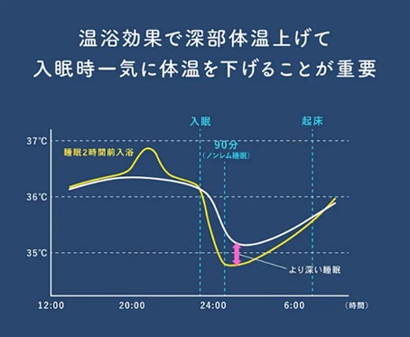 就寝2時間前の温浴で深部体温を上げる重要性が注目されていますが、今回もぬるめの重炭酸温浴で深部体温をいったん上げることで、就寝に入る際の下げ幅が確保され、深い眠りにつく準備に役立ったと考えられます。