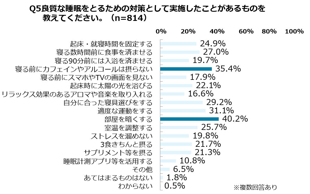 Ⅲ. 良質な睡眠をとるために実践していることTOP2は「部屋を暗くする」、「寝る前にカフェインやアルコールを摂らない」。