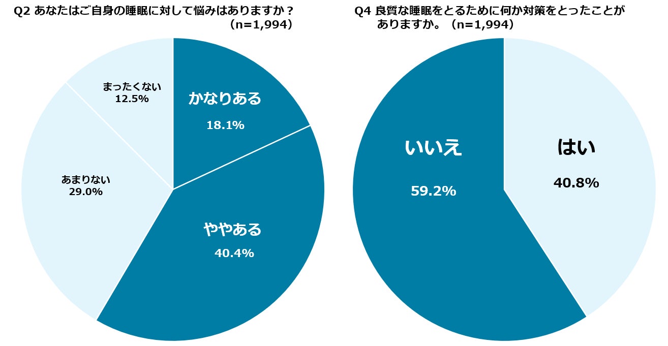 キューサイは全国の30代~70代の男女1,944名を対象に、「睡眠」に関する意識調査を実施しました。今回の調査では、睡眠に対する悩みを抱える方は全体の半数を超える58.5%、良質な睡眠をとるための対策をしたことがある方40.8%となり、睡眠の悩みがある割合と比較して対策をしていない割合が多いことがわかりました。