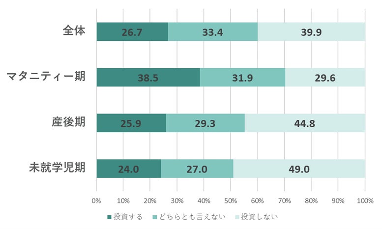 健康に対するお金の投資意識も時間投資と同様に、マタニティー期が最も高く38.5%となり、一般女性の26.7%から上昇しています。しかし産後0-12ヶ月期には25.9%、未就学時期には24.0%へと低下し、一般女性よりも投資意識が低い状況となっています。