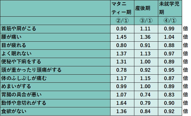 一般の女性と比較した上昇率の推移を見ると、産後期では「腰が痛い」が1.36倍と最も高い結果となりました。次いで、「体のふしぶしが痛む」1.15倍、「首筋や肩がこる」1.11倍となっています。