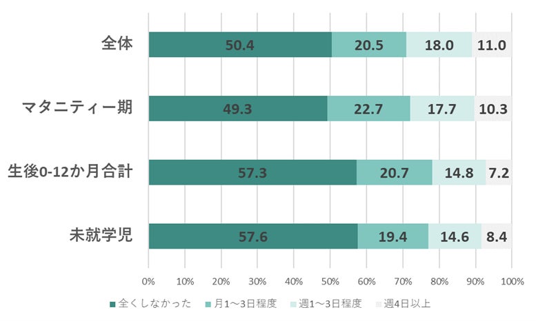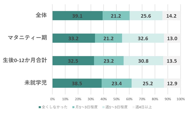 1日30分以上の運動頻度では、一般男性は39.1%の方がほぼ行動していませんが、産後0-12ヶ月期の男性は32.5%と逆に運動頻度が上昇する結果となりました。