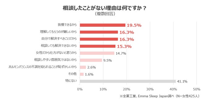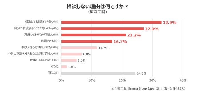 7.9割の女性が働いていて何かしらの不調を感じているが、半数以上が相談をしていないことが判明。相談しない理由には、「相談しても解決できない」、「自分で解決することだと思っている」、「理解してもらうのが難しい」との回答が挙げられ、我慢する人が多い傾向に。