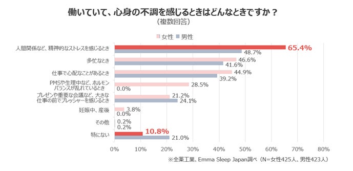 4.6割以上の女性が「人間関係などの精神的なストレス」が原因で、働きながら心身の不調を感じると回答。女性の方が不調を感じやすい傾向も。