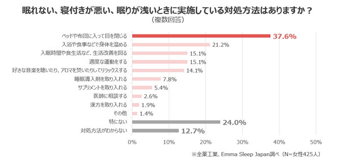 また、「眠れないときに実施している対処方法」について伺ったところ、4割近くもの人が「目を閉じる」だけで済ませているほか、「特にない」、「対処法がわからない」と回答した人も一定数いることがわかりました。正しい対処法を知らない又は根本的な改善には繋がらない簡易的方法でしのいでいる人が多いようです。