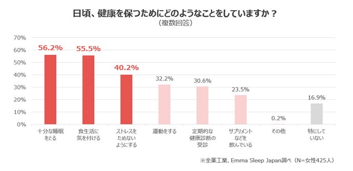 「日頃、健康を保つためにどのようなことをしていますか?」と伺ったところ、「十分な睡眠をとる」、「食生活に気を付ける」、「ストレスをためないようにする」がTop3となりました。このことから、日々の睡眠の重要性を認識している生活者が多いことが推測されます。