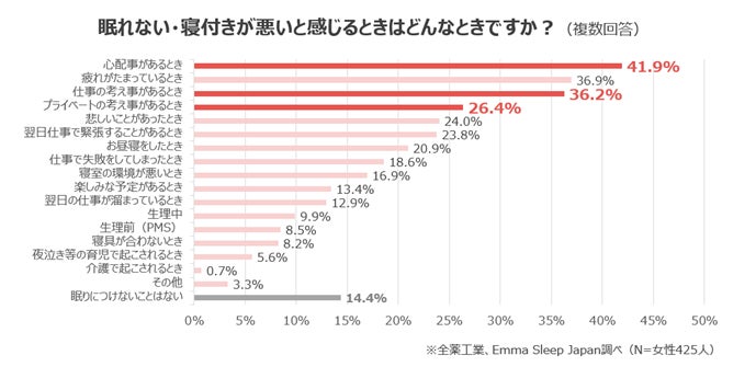 続いて、「眠れない・寝付きが悪いと感じるときはどんなときですか?」と伺ったところ、「心配ごとや、仕事・プライベートの考えごと」があるときに眠れないと感じている人が多く、心理的な要因が睡眠に影響を与えていることがうかがえます。また、「眠りにつけないことはない」と回答した人が15%に満たないことから、働く女性の多くが睡眠について何らかの課題を感じているのではと推測できます。