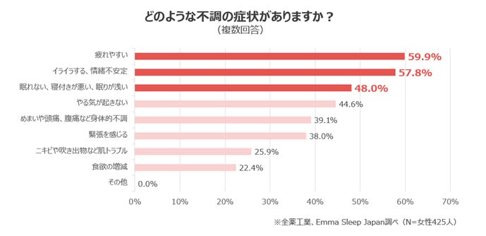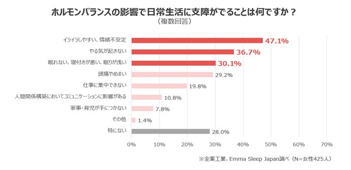 8.7割以上が、ホルモンバランスによる影響で「イライラ、やる気が起きない、不眠」などの症状が起こり、日常生活に支障をきたしていると回答。