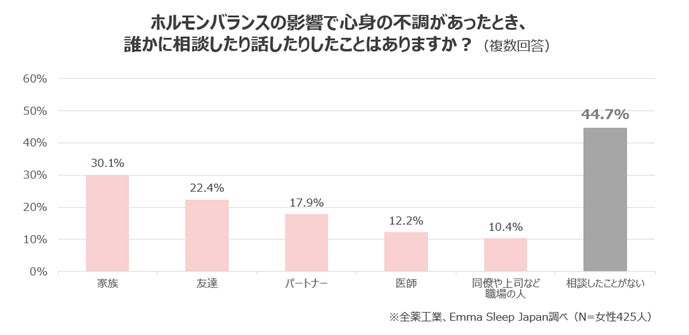 最後に、「ホルモンバランスの影響で心身の不調があったとき、誰かに相談したり話したりしたことはありますか?」と質問したところ、「相談したことがない」という回答した人が半数近くに上り、最も多い割合を占めました。相談したことのある人も家族や友達が多く、職場の同僚や上司に相談したことがある人は1割程度でした。この結果から、職場の人たちに相談することへのハードルの高さがうかがえます。