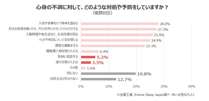 「心身の不調に対して、どのような対処や予防をしていますか?」と質問したところ、「入浴や食事などで身体を温める」、「好きな音楽を聴いたり、アロマを焚いたりしてリラックスする」、「入眠時間や食生活など、生活改善を図る」など簡易的なものが上位を占め、「特にない」「対処法がわからない」と回答した人が一定数いることがわかりました。医師や漢方の力に頼る人は一桁台と少なく、不調を感じても、なんとなく我慢して乗り切ってしまっている人が多いのではと推測ができます。