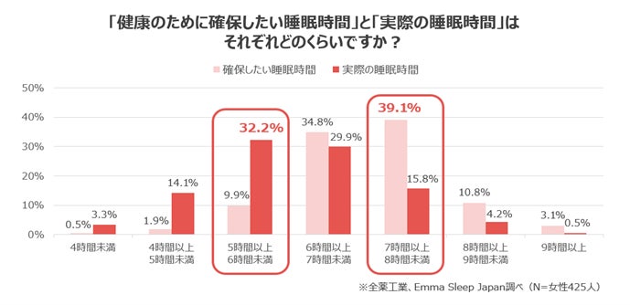 2.「健康のために確保したい睡眠時間」と「実際の睡眠時間」には約2時間のギャップがあると判明。