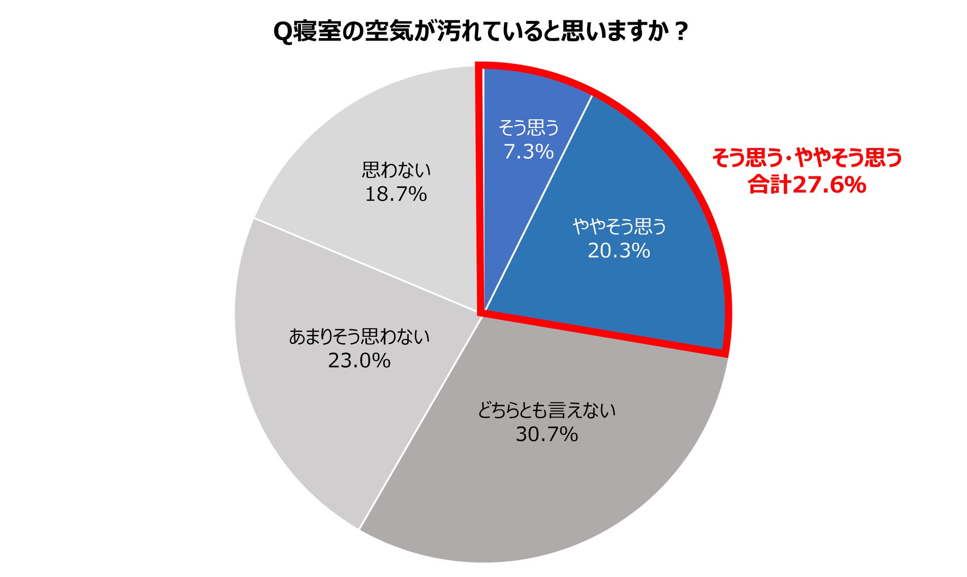 ・寝室の空気が汚れていると感じている人は27.6%いるが、睡眠の質を改善する目的で寝室に空気清浄機を設置している人は12.7%に留まる結果に。