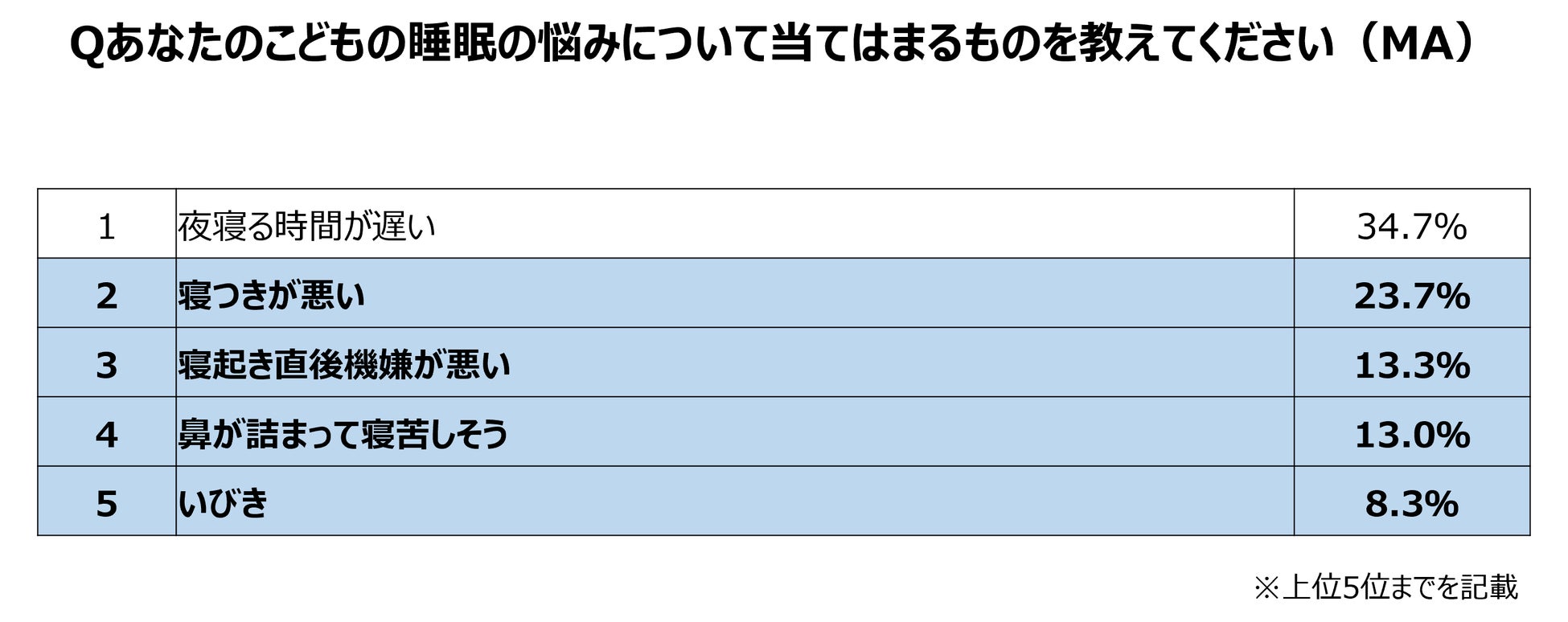 悩みの1位は「夜寝る時間が遅い」であるものの、「寝つきが悪い」「寝起き直後機嫌が悪い」「鼻が詰まって寝苦しそう」「いびき」などにも多くの方が悩んでいた。