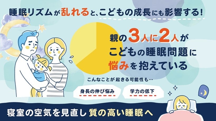 こどもの睡眠の質に悩む親は約3人に2人!「睡眠時間」だけでなく「寝つきが悪い・寝苦しそう」など睡眠全体の質に関する声も 睡眠のリズムが乱れると、身長の伸び悩みや学力低下などに影響すると専門家も警鐘