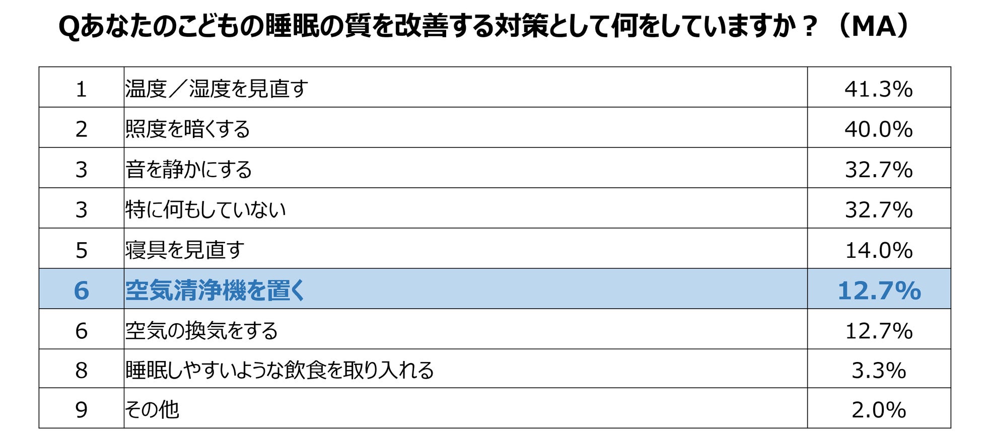 | ◆調査結果のポイント・未就学児のこどもを持つ親の約3人に2人がこどもの睡眠の質に悩みを抱えていた。 悩みの1位は「夜寝る時間が遅い」であるものの、「寝つきが悪い」「寝起き直後機嫌が悪い」「鼻が詰まって寝苦しそう」「いびき」などにも多くの方が悩んでいた。・こどもの睡眠に関して悩んでいても、改善のための対策をしていない人が約7割。 寝室の空気が汚れていると感じている人は27.6%いるが、 睡眠の質を改善する目的で寝室に空気清浄機を設置している人は12.7%に留まる結果に |