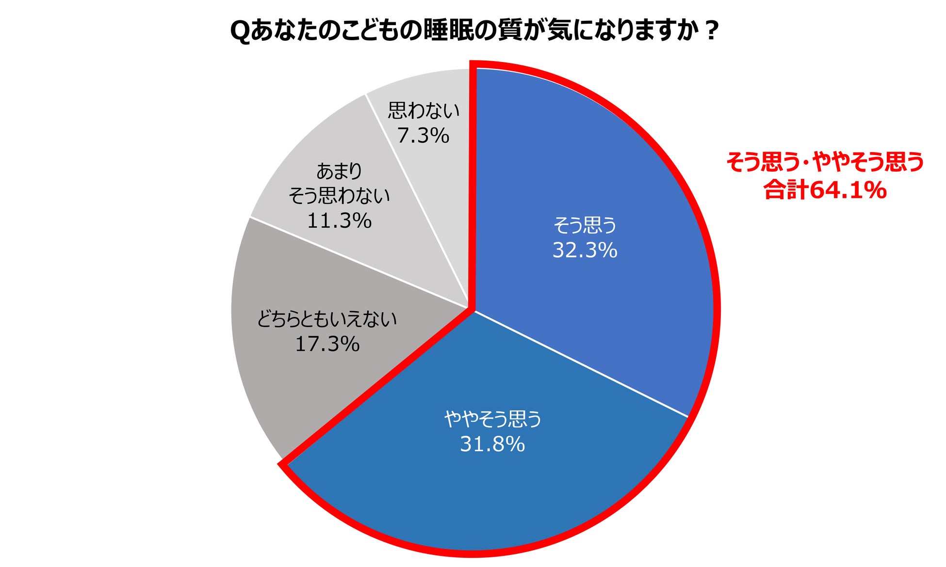 調査では、こどもの睡眠の質が気になる親が「そう思う(32.3%)」「ややそう思う(31.8%)」を合わせ、64.1%の結果となり、約3人に2人いることが分かりました。具体的な睡眠に関する悩みに対しては、「夜寝る時間が遅い(34.7%)」が1位となるが、2位以降では、「寝つきが悪い(23.7%)」「寝起き直後機嫌が悪い(13.3%)」「鼻が詰まって寝苦しそう(13.0%)」「いびき(8.5%)」となり、寝る時間だけでなく、睡眠中の質に関して悩みを抱えているという結果になりました。