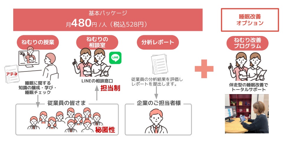 ねむりの応援団は、健康経営に取り組む企業の従業員をサポートする健康経営サービスです。利用者には睡眠の専門家がパーソナルトレーナーとして伴走し、従業員の疾病予防、生産性向上、メンタルリスクの低減につながる睡眠改善アドバイスを行います。健康経営を推進したい施策担当者に代わり、運用から振り返りまでを全てサポートしています。